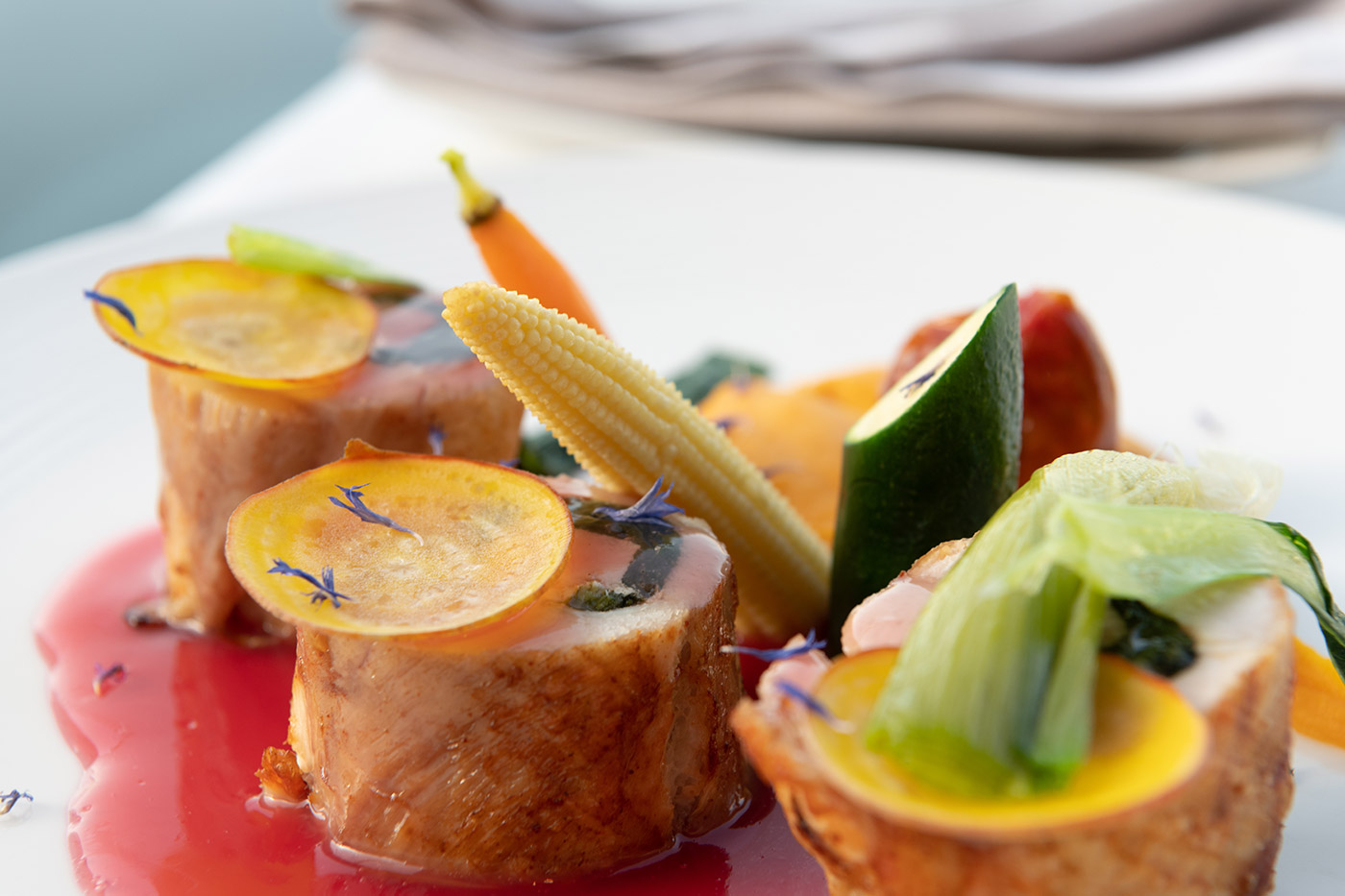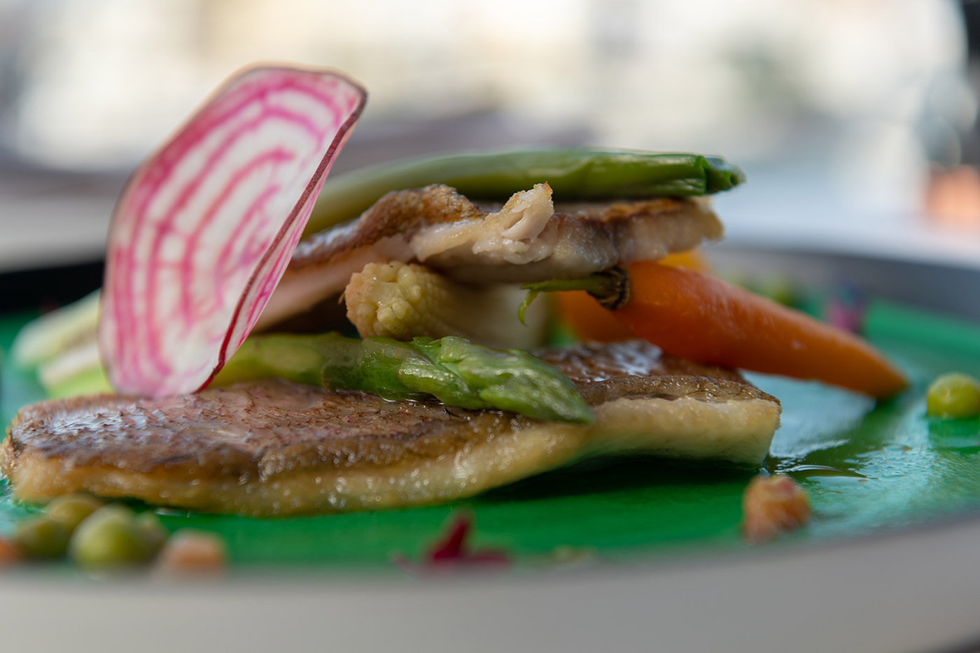 γαλλικής κοπής με την σάλτσα του, ψητή μελιτζάνα, σπαράγγια και καρότα baby