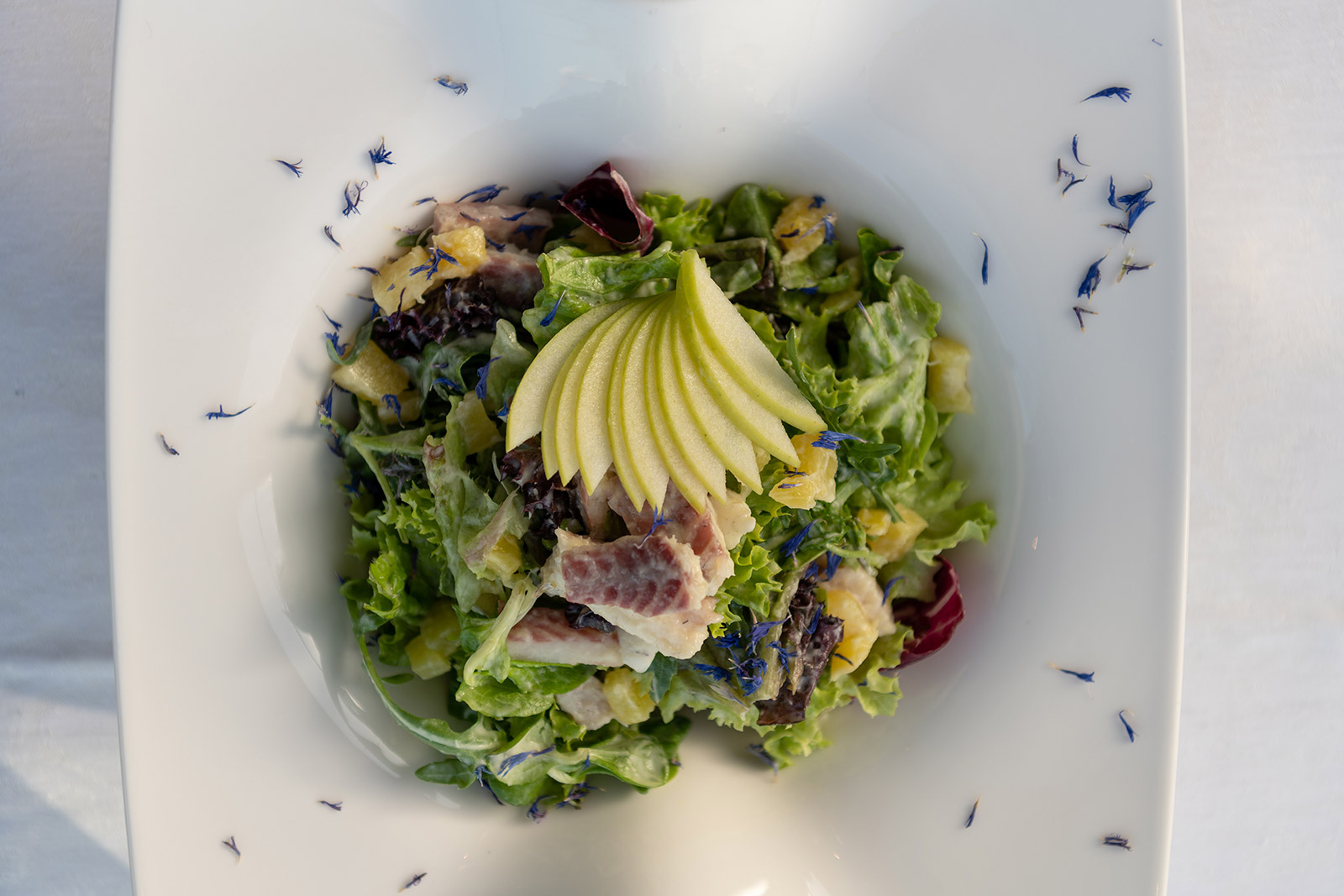 με το δέρμα του και κομμένο σε ταλιάτα πάνω σε πουρέ καρότου, γλυκόξινη σάλτσα και μικρή δροσερή σαλάτα
